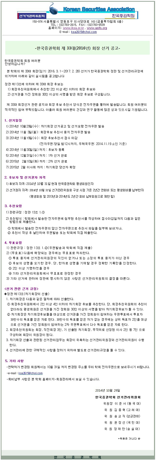 한국증권학회 제33대(2016년) 회장 선거 공고