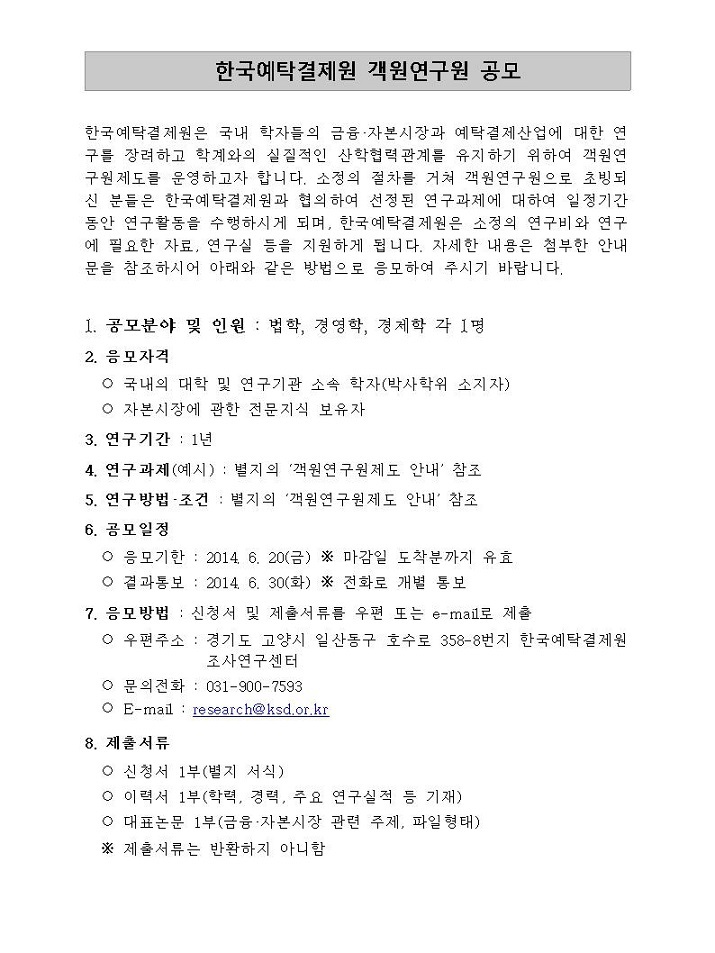 한국예탁결제원 객원연구원 공모