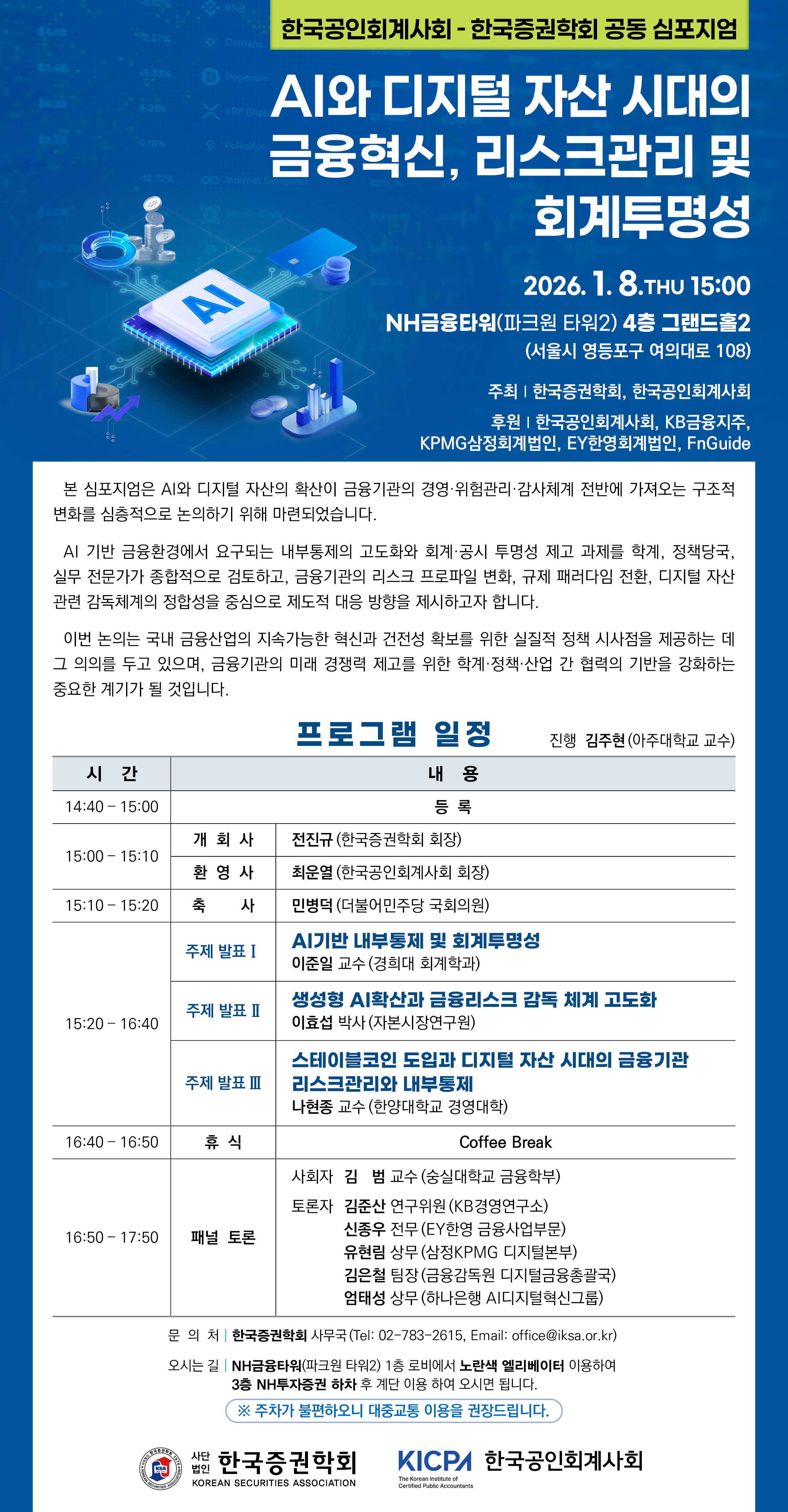 1월 8일 한국증권학회-한국공인회계사회 공동 심포지엄『AI와 디지털 자산 시대의 금융혁신,리스크관리 및 회계투명성』개최 안내